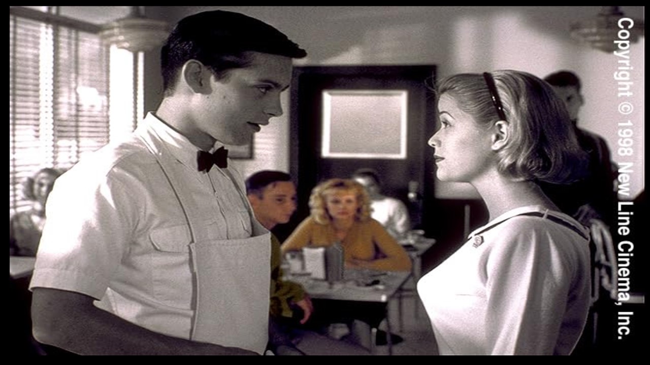 Black and white film still of a man and woman in a diner, facing each other. In the background, two other characters who have been colourized sit at a table.